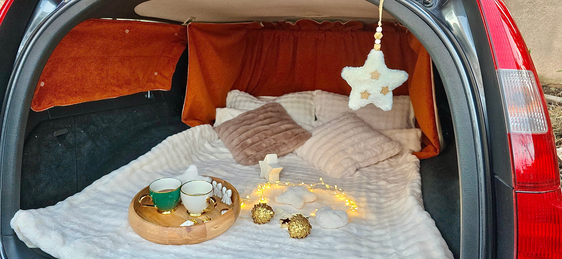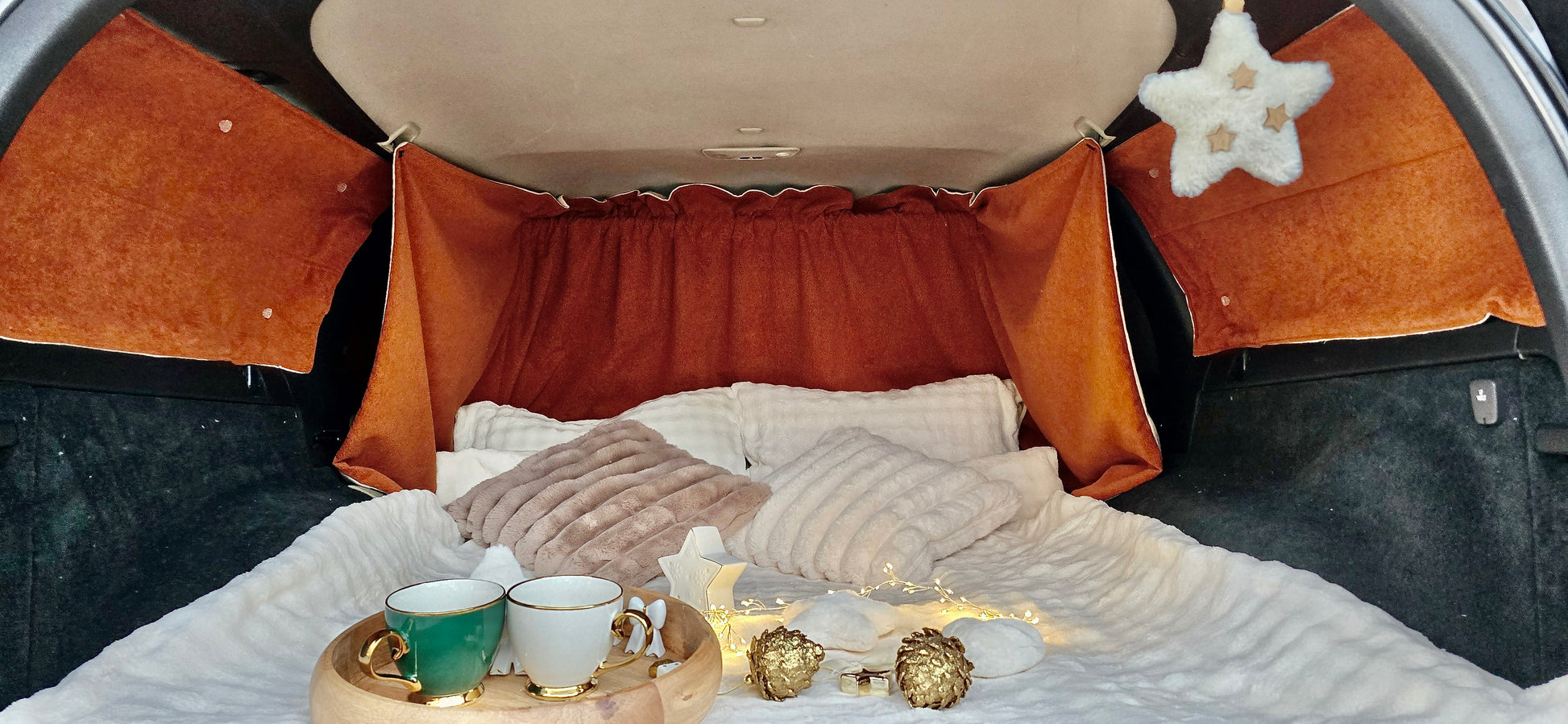 When you'll park the car to visit a nice place, to walk on the countryside, or to enjoy surfing on the beach, nobody will guess that your Volvo V70 is a little camper van. Our curtains set are 100% blind and provide intimacy and security.